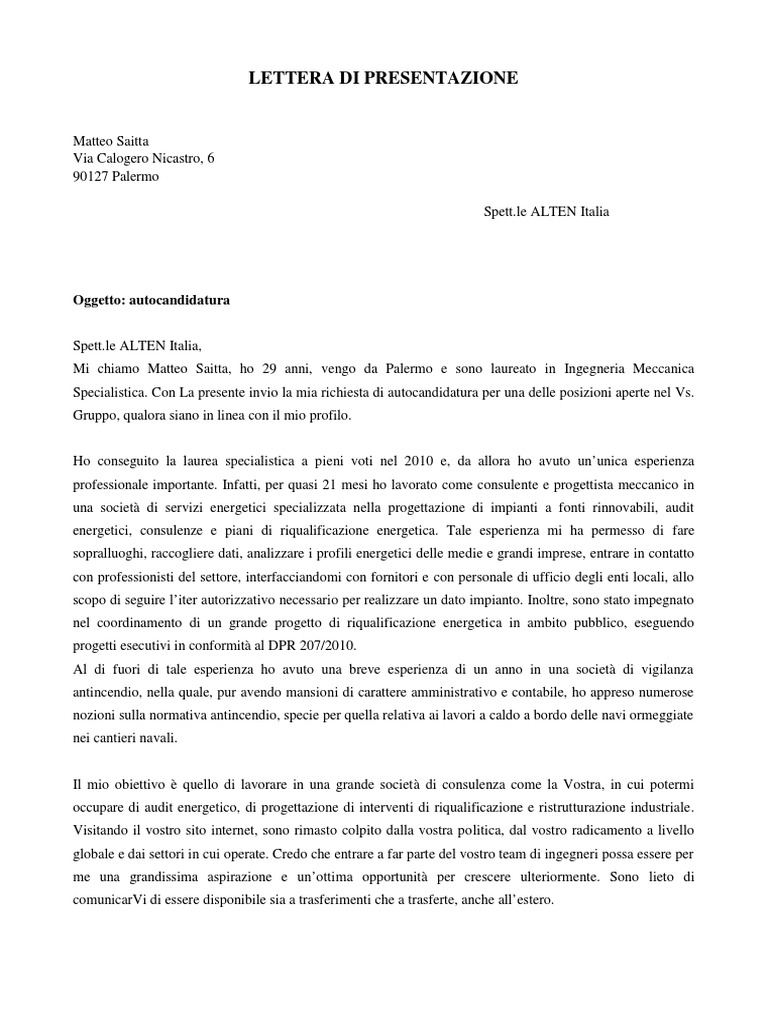 Come presentarsi in un Curriculum cartaceo o via email Ora smetti i panni del datore di lavoro e torna a quelli del candidato che sta consegnando a mano il proprio Curriculum cartaceo. Hai l'attenzione della persona che hai davanti. Che cosa dici? Ecco alcuni esempi: Buongiorno, mi chiamo Giorgio, so che state cercando un cameriere e vorrei candidarmi. Come scrivere una lettera di presentazione in inglese La lettera motivazionale, che sia di accompagnamento a una autocandidatura spontanea o per un preciso posto di lavoro, deve essere composta da parti essenziali: PARTE INIZIALE: "Dear Mr/Ms. XXX" INTRODUZIONE: In cui richiami l'annuncio di lavoro pubblicato sul loro sito, su una bacheca. Insomma devi far capire al selezionatore dove hai ... ape - nellanotizia.net Come Scrivere una Lettera di Dimissioni. 21-09-2022 138. Lavoro e Formazione. Cessione Ramo d'Azienda: Cosa succede al Lavoratore? ... Offerte di lavoro in Svizzera (Canton Ticino) senza esperienza. 03-09-2022 345. Lavoro e Formazione. Esempio Lettera di Presentazione Autocandidatura. 02-09-2022 203. Lavoro e Formazione. Aziende Farmaceutiche ... auto - nellanotizia.net Esempio Lettera di Presentazione Autocandidatura 02-09-2022 203 Musica LA CORELLI DEBUTTA A BRISIGHELLA CON UNA DELLE SUE PRODUZIONI PIÚ AMATE 03-09-2022 207 News Lo sport rende felici, incrementa consapevolezza, sviluppa autoefficacia 22-08-2022 209 Economia e Finanza Fine degli sconti ed inflazione fanno risalire i premi Rc auto: in Veneto +6,3%