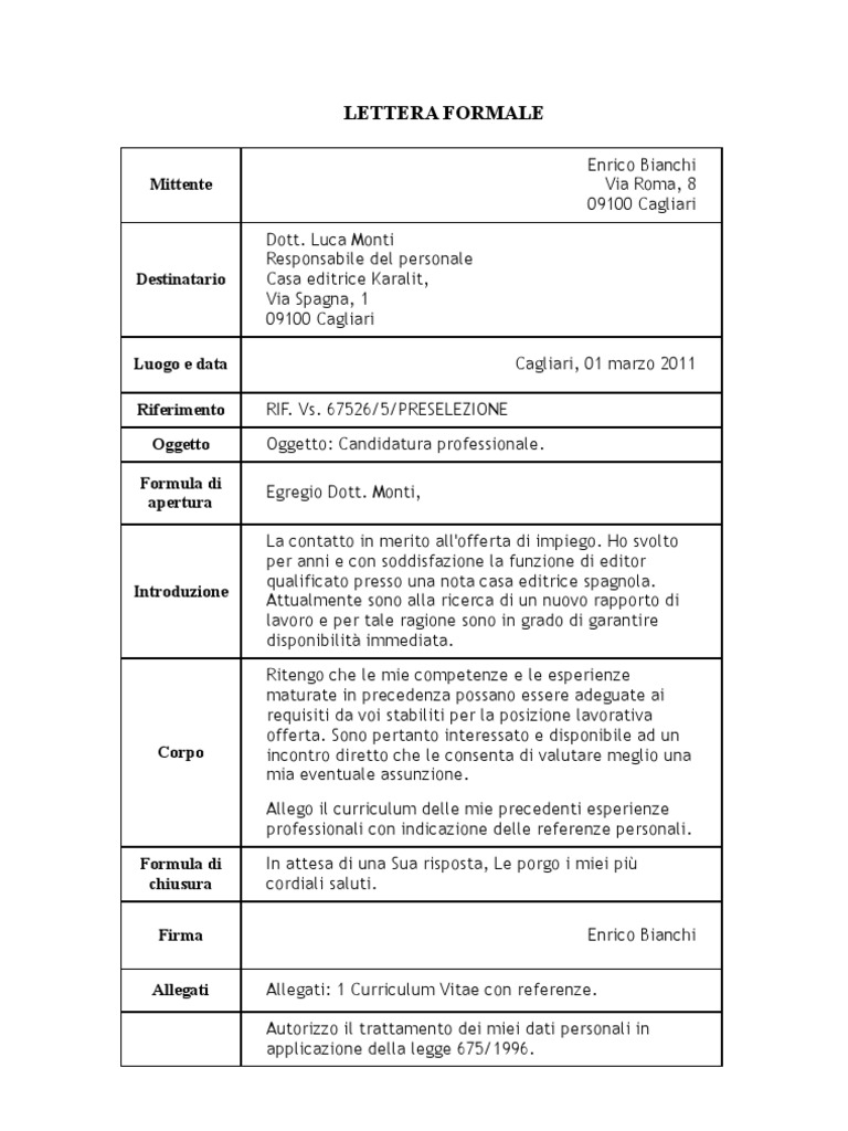 › scrittura › lettera-formaleLettera formale: come scrivere una lettera formale perfetta Jan 07, 2012 · Passiamo ora a descrivere la struttura di una lettera formale. Essa è composta dalla seguenti sezioni: Mittente. Il mittente è colui che invia la lettera formale. Di solito, questa sezione contiene un logo – se il mittente è un’azienda –, il nome del mittente, il suo indirizzo, il suo numero di telefono e la sua e-mail. Come scrivere una lettera ad un ambasciatore | Soldioggi Occorre inserire sulla sinistra il nostro nome, cognome e indirizzo. Sulla destra invece, va l'indirizzo dell'ambasciata. Per iniziare la lettera va benissimo un "Egregi o Egregio" scritto per esteso, evitando quindi le abbreviazioni come Egr., Sig. Ecco come strutturare la lettera: Nostro Nome e Cognome Indirizzo Spettabile