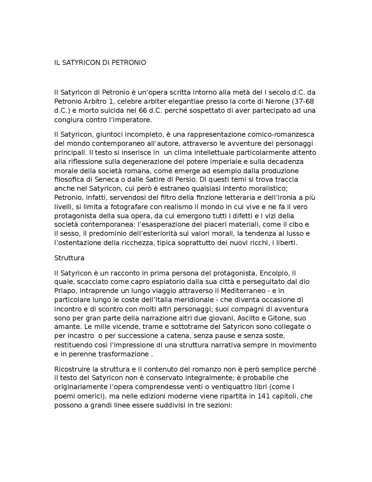 Petronio Arbitro - Wikipedia Il capolavoro di Petronio (nonché sola opera giuntaci di lui) è il Satyricon, scritto nella metà del I secolo, durante l'impero di Nerone. Dell'opera, in almeno 16 libri, possediamo frammenti del libro XIV, l'intero XV (identificabile con la coena Trimalchionis [10] ), frammenti del libro XVI e sparse citazioni in altri autori.
