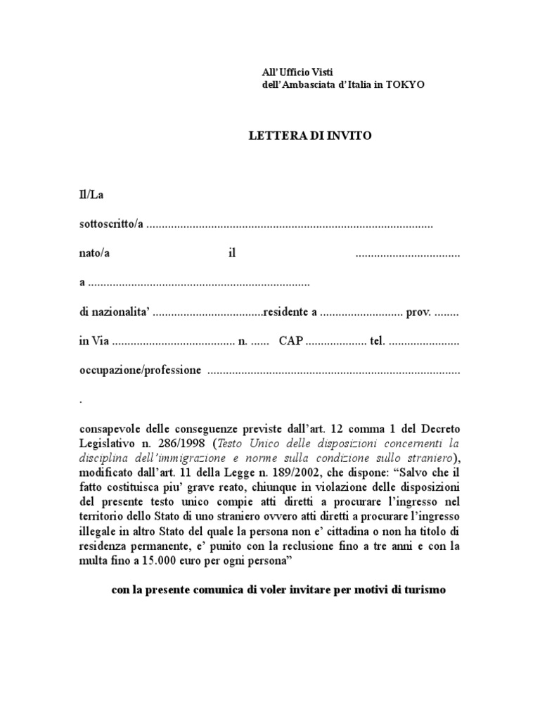 Lettera invito visto italia. Lettera di invito per familiare 2022 pdf - Stranieri d'Italia La lettera di invito va inviata al cittadino o il familiare straniero che vuole venire come ospite in Italia e sarà la sua cura portarla all' Ambasciata Italiana o al Consolato Italiano presente nel suo paese, per ottenere il visto turistico italia 2022. Autocertificazione lettera di invito 2022 Come scrivere una lettera d'invito ad un evento - vynnlife.com Ricerche correlate a Fac-simile lettera di invito a convegno o manifestazione: fac simile lettera invito cena di classe, fac simile lettera invito indagine di; Lettera di invito a un evento. Fonte di informazioni: angoloimpresa.com; Rating: three ⭐ ( 8850 Rating ) Abbina risultati di ricerca: Che sia per un convegno o per una inaugurazione ... Visti - Esteri VISTI INGRESSO IN ITALIA . Per presentare domanda di visto, è necessario prendere un appuntamento con la soc. TLSContact, nei seguenti modi: Telefono: dal Marocco: 05 30 92 92 50 / dall'Italia e dall estero: 00212 5 30 92 92 50 - dal lunedi al venerdi dalle 08:00 alle 17:00; Lettera d'invito per turismo, ano ito? - Ako Ay Pilipino Ang lettera d'invito ay isang liham kung saan nagbibigay abiso sa awtoridad ng Italya ng pagnanais na imbitahan para sa maikling panahon ang kamag-anak o kaibigan mula sa Pilipinas sa pamamagitan ng tourist visa.