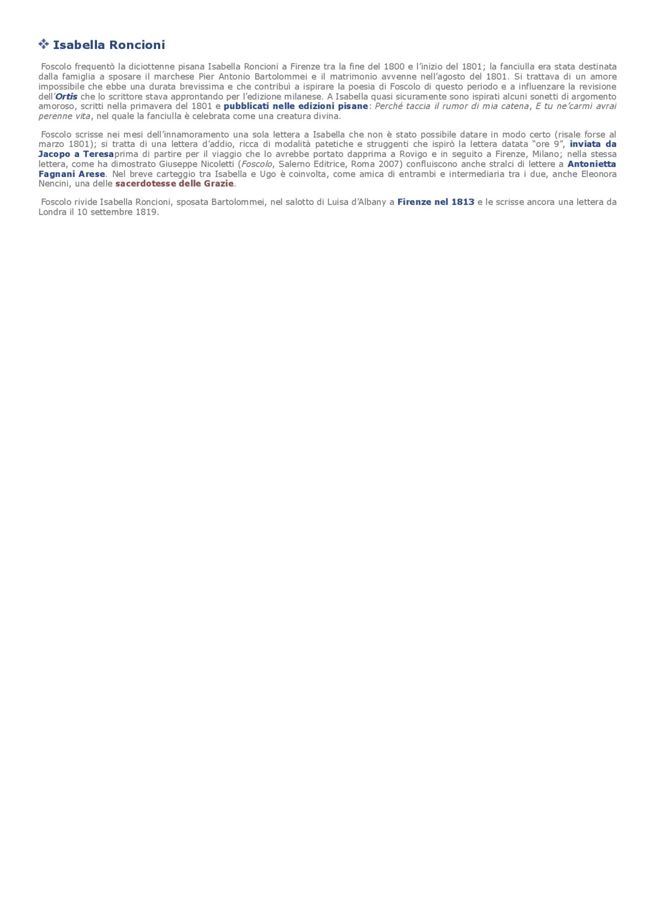 Isabella Roncioni - Internet Culturale Nel breve carteggio tra Isabella e Ugo è coinvolta, come amica di entrambi e intermediaria tra i due, anche Eleonora Nencini, una delle sacerdotesse delle Grazie. Foscolo rivide Isabella Roncioni, sposata Bartolommei, nel salotto di Luisa d'Albany a Firenze nel 1813 e le scrisse ancora una lettera da Londra il 10 settembre 1819.